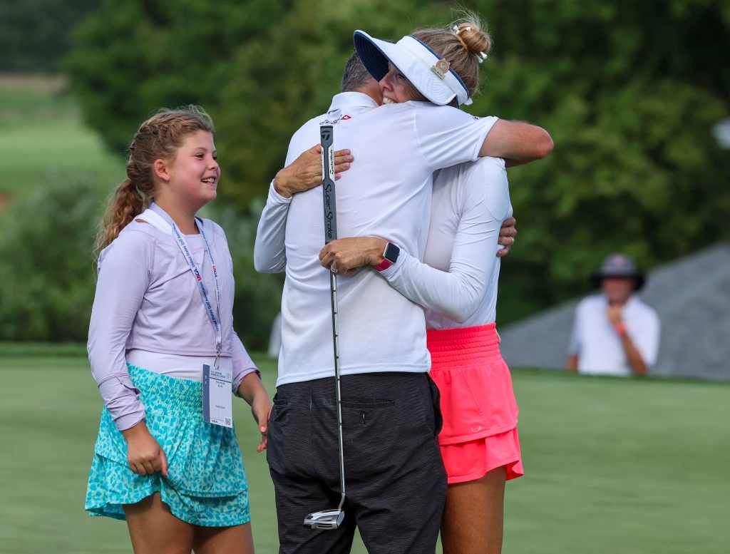 McGill receives a hug from her husband as their daughter, Bella, enjoys the moment on Sunday. (Photo: Jeff Haynes/USGA)