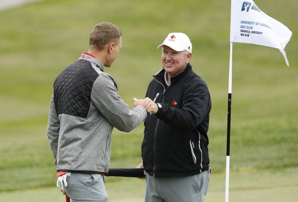 Mark Crabtree, who spent the last 21 years of his coaching career at Louisville, with one of his former Cardinals standouts, Matti Schmid. (Photo: University of Louisville)