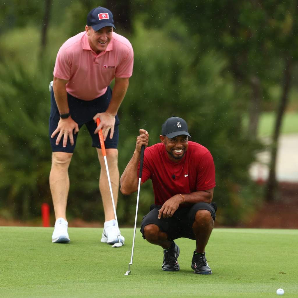 Peyton Manning (left) with Tiger Woods at The Match in 2020.