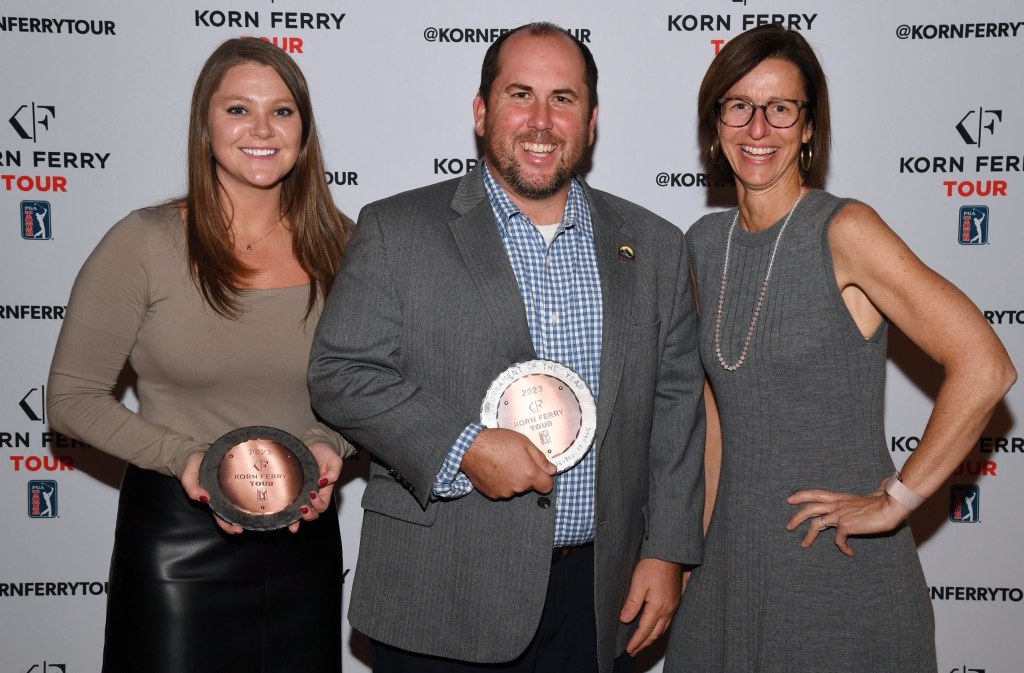 Drew Blass, tournament director for The Ascendant presented by Blue, with Korn Ferry Tour president Alex Baldwin (right) and Alyx Donahue, championship coordinator for The Ascendant.