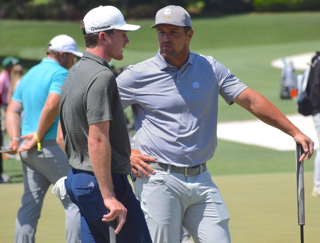 Nick Dunlap (left) chats on Monday with fellow former U.S. Amateur champion Bryson DeChambeau.
