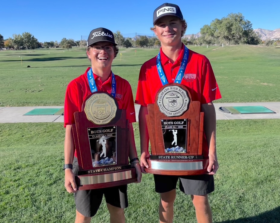 Senior Miles Kuhl (left) and sophomore Ash Edwards placed 1-2 in the individual competition at the 5A state tournament at Bookcliff CC.